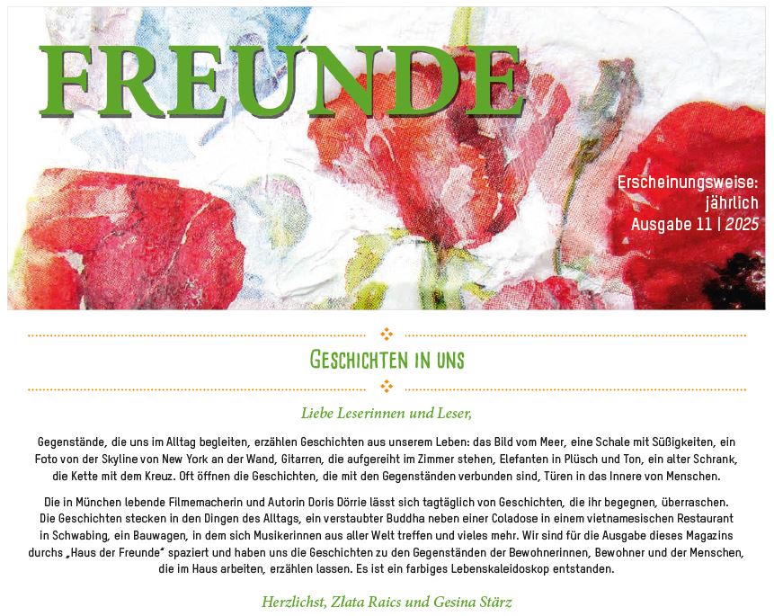Das Leitungsteam verfasst gemeinsam mit den Bewohnerinnen und Bewohnern einmal im Jahr das Magazin "FREUNDE", das einen kleinen Einblick in dieses besondere Pflegeheim gibt. Mit klick auf die Bildunterschrift können Sie es sich herunterladen.